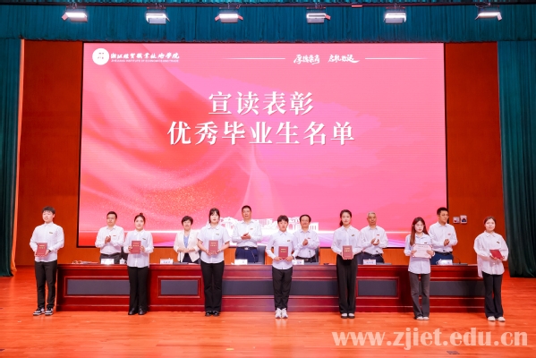副校长林锋宣读《关于表彰2024届优秀毕业生的决定》。115人荣获“2024届浙江省普通高等学校优秀毕业生”称号,388人荣获“2024届校级优秀毕业生”称号。学校领导为浙江省优秀毕业生代表、学校优秀毕业生代表颁发荣誉证书,并为毕业生代表颁发毕业证书、赠送纪念徽章和《毕业生廉洁从业教育手册》等毕业专属纪念品,勉励全体毕业生坚定自信,一路清风,追光前行。